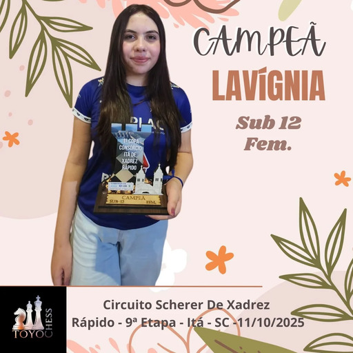 Competindo na modalidade rápido, em seis rodadas, Lavígnia somou 4,5 pontos e garantiu mais uma vitória importante na temporada. Com o resultado, ela segue na liderança geral das etapas do circuito, consolidando seu destaque entre as jovens promessas do xadrez catarinense.