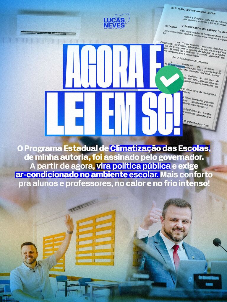 O projeto que eu propus, e que aprovamos na Alesc, foi sancionado pelo governador Jorginho Mello. Agora, Santa Catarina passa a contar com um Programa Estadual de Climatização nas Escolas, garantindo conforto térmico nas salas de aula, tanto no inverno quanto no verão. É mais dignidade pra alunos e professores e um passo importante pra melhorar, de forma definitiva, a estrutura das nossas escolas. Uma lei que faz avançar, e não deixa retroceder!