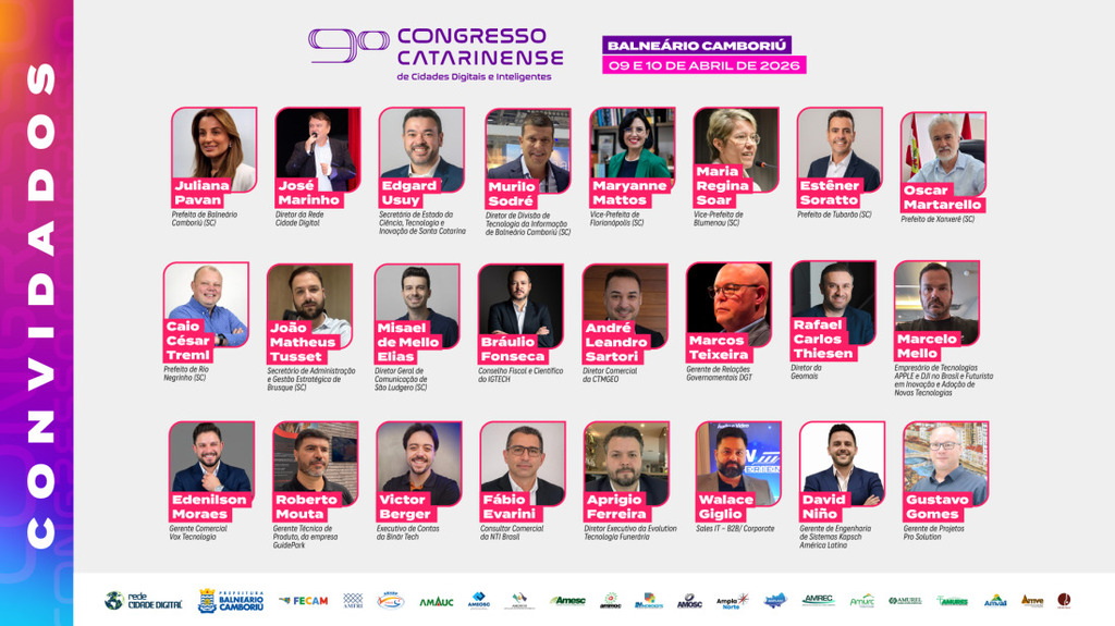 Participam como palestrantes do evento o integrante do Conselho Fiscal e Científico do IGTECH, Bráulio Fonseca; o diretor comercial da CTMGEO, André Leandro Sartori; o secretário de Estado da Ciência, Tecnologia e Inovação de Santa Catarina, Edgard Usuy; o gerente de Relações Governamentais da DGT, Marcos André Teixeira da Rosa; a vice-prefeita de Blumenau (SC), Maria Regina de Souza Soar; o diretor da Geomais, Rafael Carlos Thiesen; o empresário de tecnologias Apple e DJI no Brasil e futurista em inovação e adoção de novas tecnologias, Marcelo Mello; o gerente comercial da Vox Tecnologia, Edenilson Moraes; o gerente técnico de produto da GuidePark, Roberto Mouta; a vice-prefeita de Florianópolis (SC), Maryanne Mattos; o executivo de contas da Binär Tech, Victor Berger; o consultor comercial da NTI Brasil, Fábio Evarini; o secretário de Administração e Gestão Estratégica de Brusque (SC), João Matheus Tusset; o diretor executivo da Evolution Tecnologia Funerária, Aprígio Ferreira de Souza Neto; o Sales IT – B2B/Corporate, Walace Giglio; o prefeito de Tubarão (SC), Estêner Soratto da Silva Júnior; o gerente de Engenharia de Sistemas da Kapsch América Latina, David Niño; o gerente de projetos da Pro Solution, Gustavo Gomes; o diretor de Divisão de Tecnologia da Informação de Balneário Camboriú (SC), Murilo Sodré; o prefeito de Rio Negrinho (SC), Caio César Treml; o prefeito de Xanxerê (SC), Oscar Martarello; e o diretor-geral de Comunicação de São Ludgero (SC), Misael de Mello Elias.
