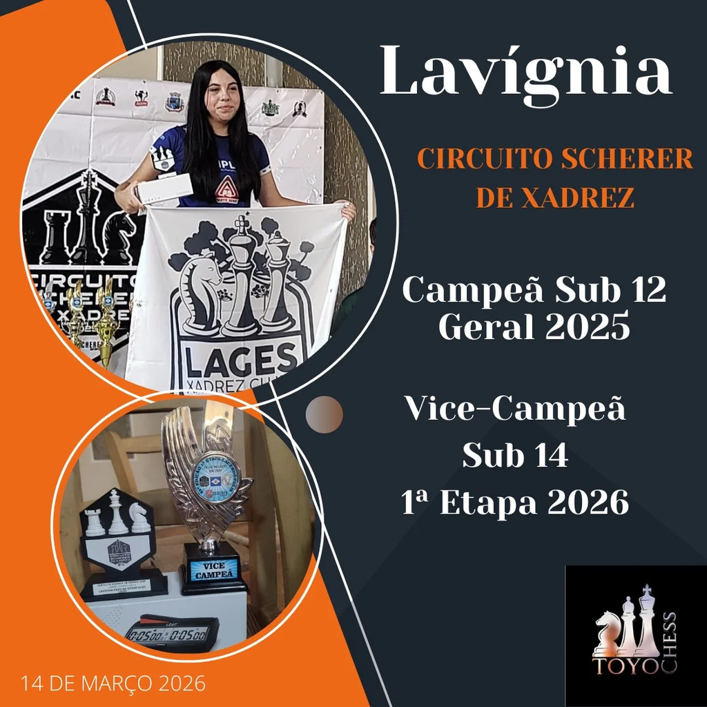 Depois de uma performance impecável em 2025, onde se sagrou Campeã Sub-12 feminino do Circuito Scherer de Xadrez, ela iniciou 2026 mostrando que seu talento só cresce. Com muita estratégia e foco, agora em uma categoria muito mais forte, o Sub 14, ela conquistou o troféu de Vice-Campeã feminina da 1ª Etapa de 2026.