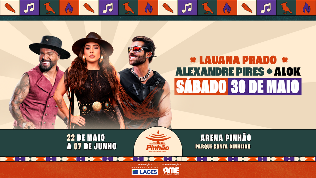 Lauana Prado, Alexandre Pires e Alok serão as atrações do segundo dia de shows da Arena Pinhão na 36ª Festa Nacional do Pinhão, no Parque de Exposições Conta Dinheiro. Os artistas irão se apresentar no dia 30 de maio (sábado) e integram a noite paga da programação da Festa Nacional do Pinhão 2026, reunindo três estilos musicais em um mesmo palco. Anúncio das atrações foi feito no evento dos 100 dias para a 36ª Festa Nacional do Pinhão, na tarde de quarta-feira (11 de fevereiro). “A programação do dia 30 de maio na Arena Pinhão reúne artistas que dialogam com públicos diferentes e coloca Lages no circuito de grandes shows nacionais durante a Festa do Pinhão”, comemora a prefeita de Lages, Carmen Zanotto.