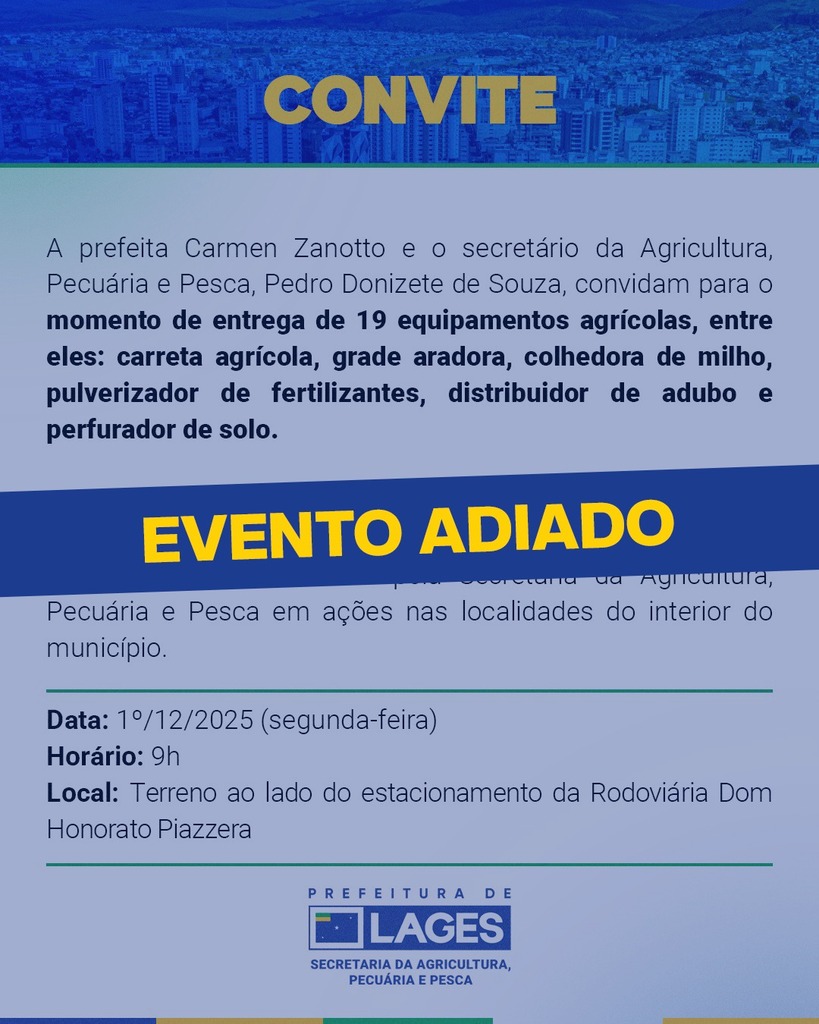 Diante do forte temporal registrado neste domingo (30 de novembro), a Prefeitura de Lages informa que o ato de entrega dos equipamentos agrícolas, que estava programado para esta segunda-feira (1° de dezembro) está ADIADO. A nova data será informada em breve.