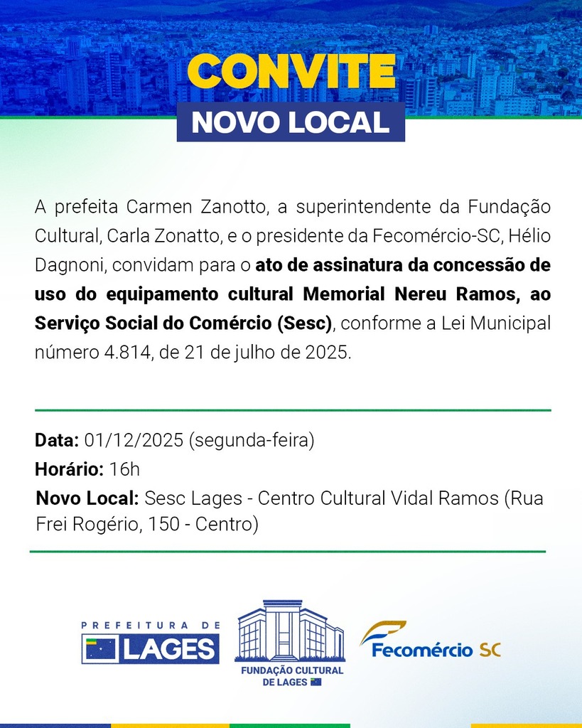 Já o ato de assinatura da concessão do Memorial Nereu Ramos, está mantido para esta segunda-feira, no mesmo horário, 16h, porém, em novo local: Sesc Lages - Centro Cultural Vidal Ramos (Rua Frei Rogério, 150 - Centro).