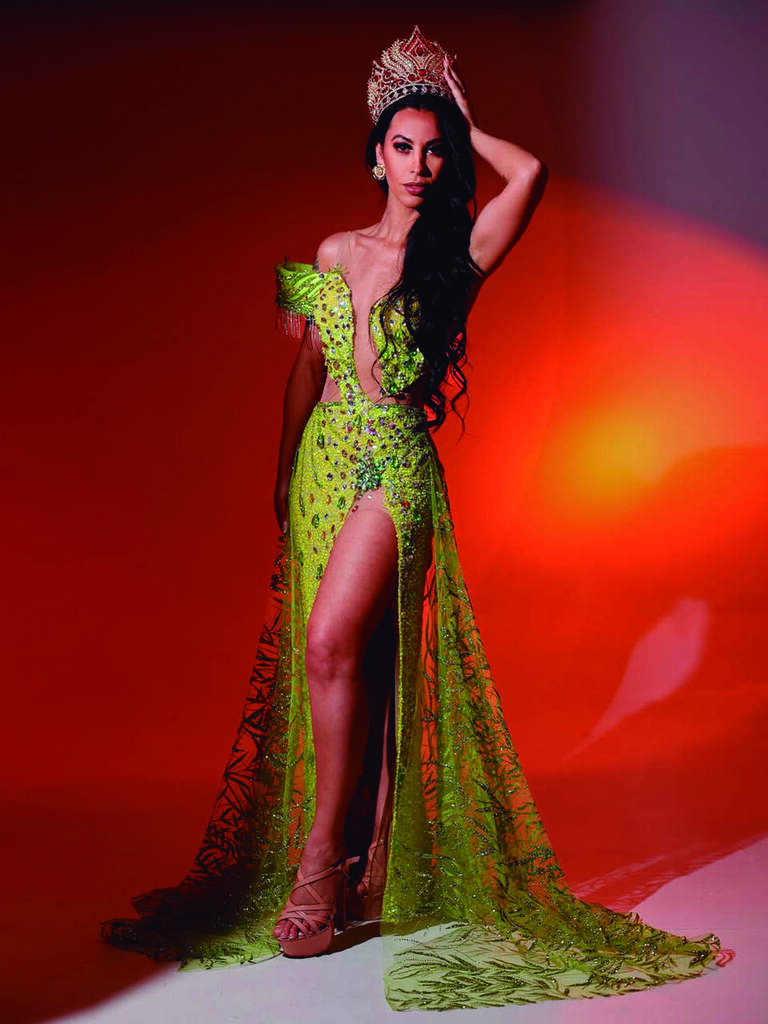 Na grande final, a candidata chamou atenção ao desfilar com um vestido verde-limão vibrante, assinado pela estilista Ana Paula Pires Coelho. A peça combinou sofisticação e brasilidade, com recortes estratégicos, aplicação de cristais, cauda fluida, fenda lateral e mangas com franjas, criando efeito luminoso e movimento na passarela.