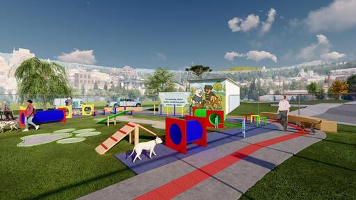 O projeto prevê áreas temáticas em areia, com formatos lúdicos de ossos e pegadas, além da implantação de um circuito completo de agility, com rampas, túneis, aros e obstáculos, garantindo atividades físicas e recreativas para os cães.