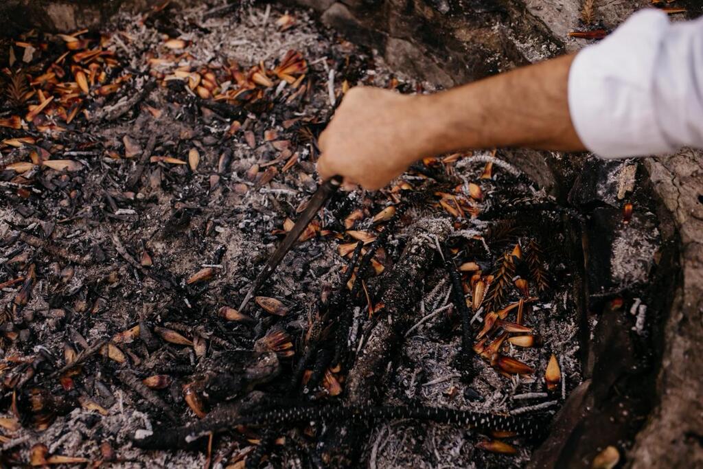 Também conhecida como “sapeco”, a prática consiste em formar uma pilha generosa de grimpas (que são os ramos/galhos secos do pinheiro), sobre os pinhões colhidos. O fogo é aceso na parte superior e, aos poucos, desce consumindo todas as grimpas, até atingir as sementes. O resultado é um sabor marcante do pinhão, deixando apenas a casca tostada por fora e o interior saboroso e pronto para o consumo.