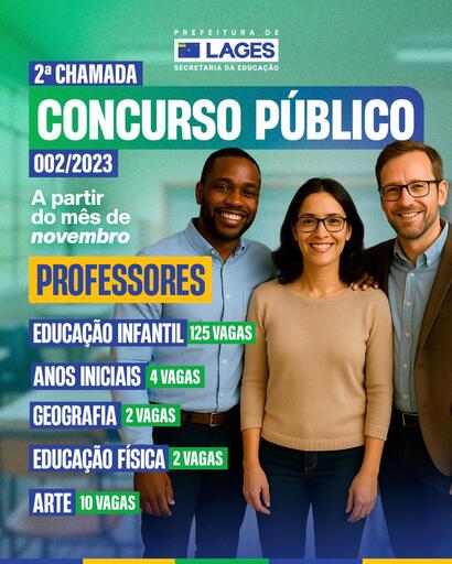 A Secretaria Municipal de Educação realizará uma 2ª Chamada do Concurso Público nº 02/2023. Serão chamados 143 professores para vagas de Educação Infantil, Anos Iniciais, Geografia, Arte e Educação Física. A convocação dos candidatos ocorrerá a partir do mês de novembro.