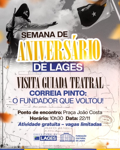 Entre os destaques da programação está a visita guiada teatral “Correia Pinto: O Fundador que Voltou!”, marcada para o dia 22 de novembro, às 10h30min, com saída da Praça João Costa. A atividade propõe uma experiência de educação patrimonial ao lado do personagem que representa o fundador de Lages, conduzindo o público por locais históricos, como, o Calçadão, Rua Nereu Ramos, Teatro Marajoara e a Praça João Ribeiro (Praça da Catedral Diocesana). A participação é gratuita, mediante inscrição online em "Correia Pinto: O Fundador que Voltou!".