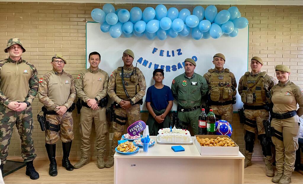 Durante o evento da 2ª Edição do Quartel Aberto, a Polícia Militar de Santa Catarina (PMSC), por meio da unidade do Comando de Polícia Militar Ambiental (CPMA), realizou, neste sábado, 4, a alegria de celebrar uma ocasião muito especial. O jovem Rayan Luiz da Silva Pereira, integrante do Projeto Semear (Grupo de Amigos Unidos para Semear o Bem), completou 13 anos de idade justamente no dia do evento.