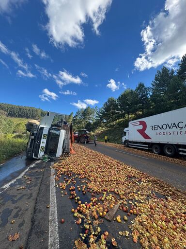 O caminhão transportava uma carga de maçãs, parte da qual ficou espalhada sobre a pista. Com apoio da Polícia Rodoviária Federal e auxílio de populares, foi feita a retirada parcial da carga para liberar o tráfego.