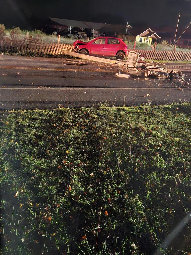 Carro colide contra poste e interdita SC-114 em São Joaquim durante a madrugada; motorista fica ferido