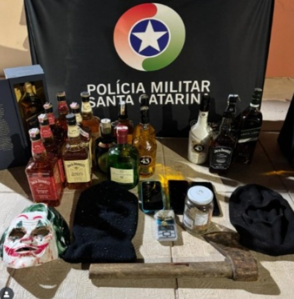 Durante as buscas, os policiais encontraram o veículo utilizado na ação criminosa e diversos objetos furtados, entre eles 16 garrafas de bebidas alcoólicas e uma mala preta usada para transportar os itens. Também foram apreendidas duas toucas do tipo balaclava, uma máscara plástica do personagem Coringa, uma machadinha, três telefones celulares, uma balança de precisão e uma pequena porção de substância semelhante à maconha.