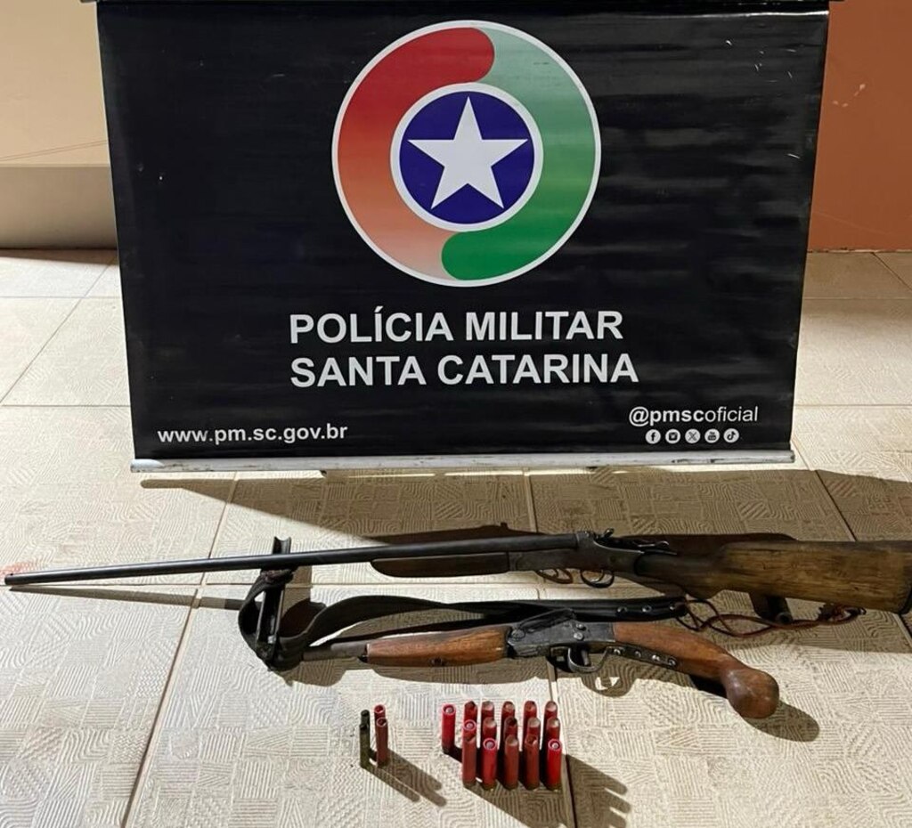 Durante buscas, os policiais localizaram duas espingardas, sendo uma de calibre .36 e outra de calibre .32. Também foram apreendidas quatro munições de calibre .36 e 16 munições de calibre .32, que estavam armazenadas em uma sacola.