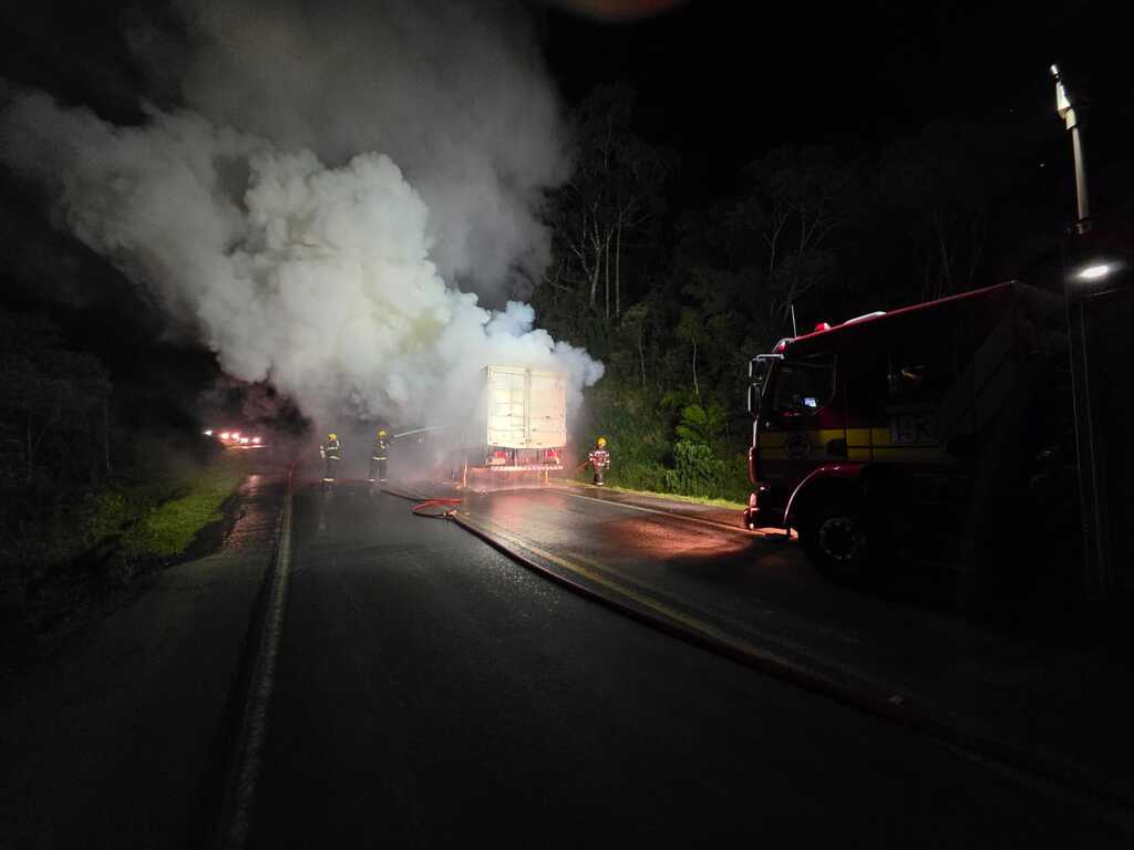 Incêndio destrói caminhão carregado com materiais recicláveis na BR-282, em Bocaina do Sul