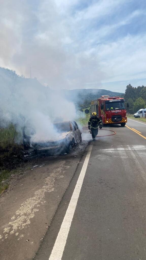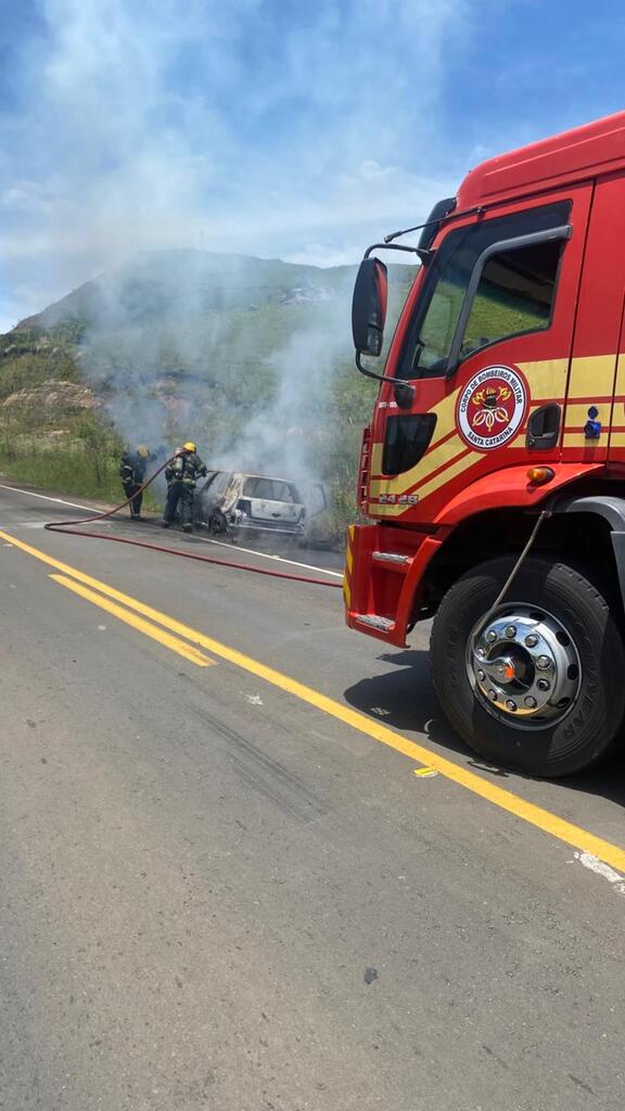 Um automóvel ficou totalmente destruído após pegar fogo na tarde de domingo (30), na SC-114, na localidade de Pedras Brancas, em Lages. O incêndio ocorreu por volta das 12h30, no km 240 da rodovia.