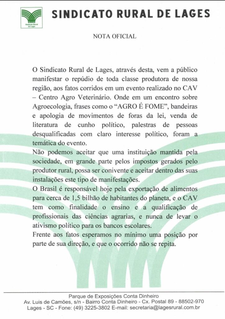 No dia 13 e 14 de maio foi realizado o 10º Seminário Catarinense de Agroecologia e a Feira da Economia Solidária e da Agricultura Familiar nas dependência do Centro Agroveterinário, o Cav campus da Udesc em Lages. A universidade se manifestou por meio de nota, pois logo após o evento muitas criticas ganharam proporção nas plataformas digitais e mídias sociais que este evento teria sido usado para fazer politica contra o atual governo federal.
