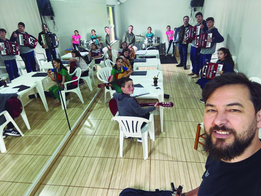 Na área musical, as oficinas também têm reunido participantes em diferentes modalidades. O professor Marcos Moraes conduz as aulas de canto, violão e violino, promovendo momentos de expressão artística e aprendizado musical. A oficina de gaita, com o professor Rafael Fachin, resgata um instrumento tradicional muito presente na cultura do sul do país. Já as aulas de percussão e bateria, com o professor Ismael Gomes, exploram ritmo e coordenação, despertando o interesse dos alunos pela música.